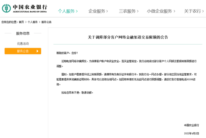 今年4月,农业银行、光大银行等多家银行相继发布公告,将根据账户使用情况,调整个人账户线上相关业务交易限额,包括线上转账限额及网上支付交易限额等。