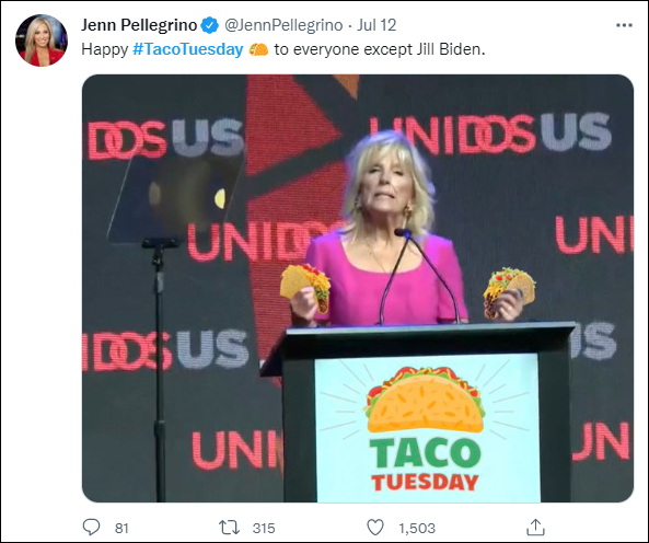 美国保守派媒体Newsmax的主持人詹恩·佩莱格里诺(Jenn Pellegrino)也发布了一张吉尔·拜登双手拿着墨西哥玉米卷的梗图,并调侃道:“祝大家星期二墨西哥玉米卷日快乐,除了吉尔·拜登。”