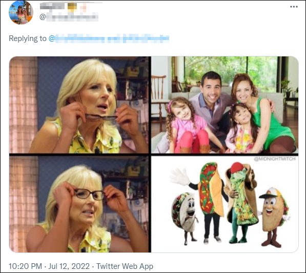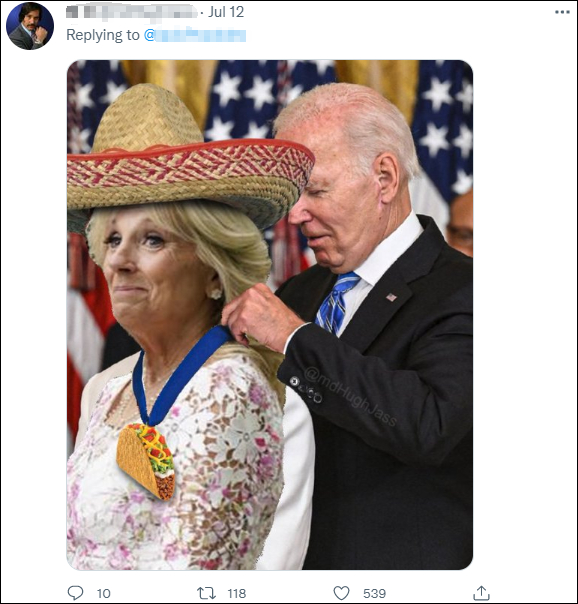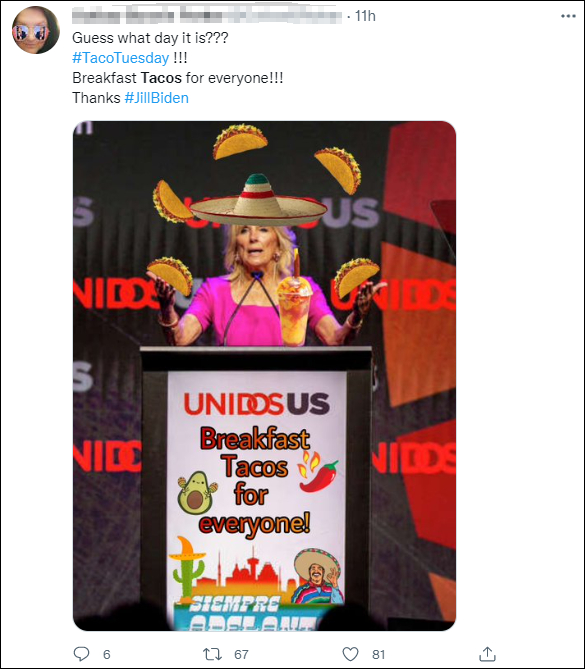 除了这些政客外,一些美国网友还开始恶搞,制作、传播吉尔·拜登头戴墨西哥草帽、手拿墨西哥玉米卷等梗图。
