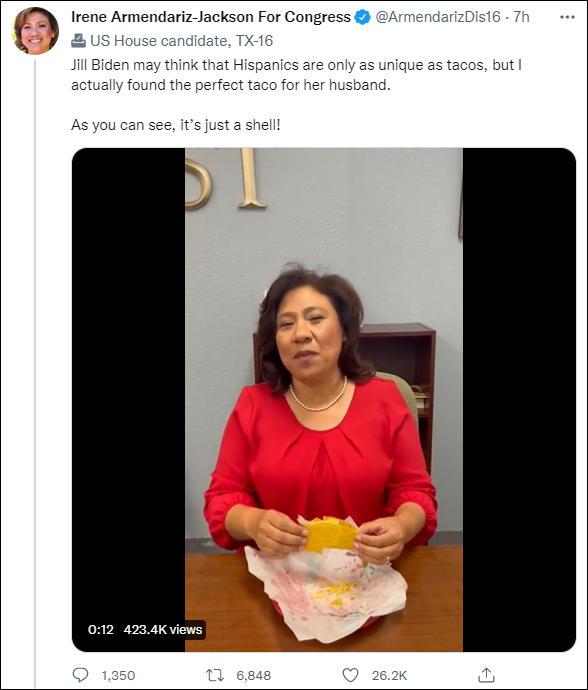 得州共和党人、拉美裔艾琳·阿门达里斯(Irene Armendariz)还发了一段自己手拿墨西哥玉米卷的视频,只见她将内馅抖落,只留下饼皮,并称这块饼皮才是最适合吉尔·拜登丈夫的墨西哥玉米卷。