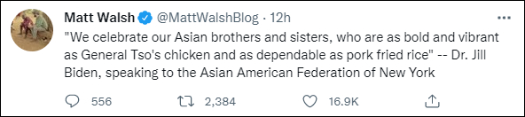 美国保守派政治评论家和作家马修·沃尔什(Matt Walsh)甚至还由此恶搞称:“‘我们赞美我们的亚裔兄弟姐妹,他们就像左宗棠鸡一样大胆、充满活力,就像猪肉炒饭一样可靠’——吉尔·拜登博士在纽约亚裔美国人联合会上如此说。”