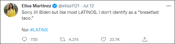 新墨西哥州共和党人、拉美裔艾丽莎·马丁内斯(Elisa Martinez)也写道:“抱歉,吉尔·拜登,但像大多数拉美裔一样,我不认为自己是‘早餐玉米卷’。 ”