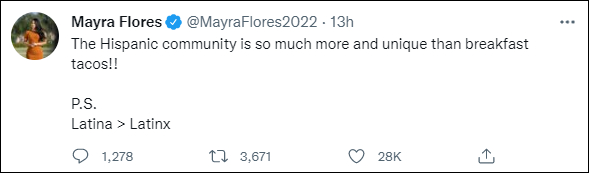 当地时间12日,美国共和党众议员、拉美裔梅拉·弗洛雷斯(Mayra Flores)在推特上喊话:“西班牙裔社区比早餐玉米卷独特多了!!”