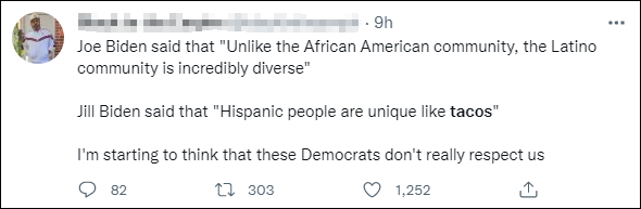 此外,一名非裔美国网民还不禁吐槽道,拜登曾称,与非裔美国人社区不同,拉美裔社区非常多样化。现在吉尔·拜登却说,“拉美裔就像墨西哥玉米卷一样独特” ,这让他“开始觉得这些民主党人并不尊重我们。”