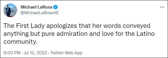 面对外界的诸多指责,吉尔·拜登在12日道歉。据美国有线电视新闻网(CNN)12日报道,当天吉尔·拜登的办公室发表了一份道歉声明。第一夫人的发言人迈克尔·拉罗萨(Michael LaRosa)发推文称:“第一夫人致歉,她的话表达的只是对拉美裔社区的纯粹赞美和爱。”