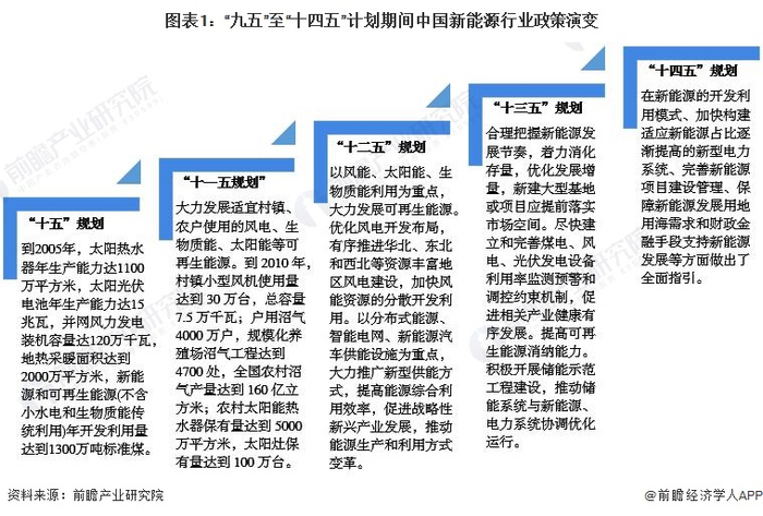 “十五”计划(2001-2005年)时期,国家层面提出加快技术进步和机制创新,推动新能源和可再生能源产业迅速发展;从“十一五”规划(2006-2010年)开始,规划提出按照“因地制宜,多元发展”的原则,在继续加快小型水电和农网建设的同时,大力发展适宜村镇、农户使用的风电、生物质能、太阳能等可再生能源;“十二五”(2011-2015年)时期,国家层面提出以风能、太阳能、生物质能利用为重点,大力发展可再生能源;至“十三五”期间(2016-2020年),合理把握新能源发展节奏,着力消化存量,优化发展增量,新建大型基地或项目应提前落实市场空间;到“十四五”时期,根据《关于促进新时代新能源高质量发展的实施方案》,国家在新能源的开发利用模式、加快构建适应新能源占比逐渐提高的新型电力系统、完善新能源项目建设管理、保障新能源发展用地用海需求和财政金融手段支持新能源发展等方面,对我国新能源行业的发展做出了全面指引。