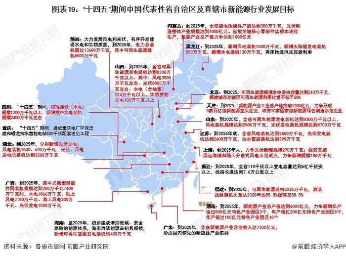 “十四五”期间,我国主要省份都提出了新能源行业的发展目标。其中,北京、上海、广东、江苏等重点省市提出了至2025年末的可再生能源新增发电装机容量、新能源产业营业收入以及风电、光伏发电等装机量目标。“十四五”期间中国代表性省自治区及直辖市新能源行业发展目标汇总如下: