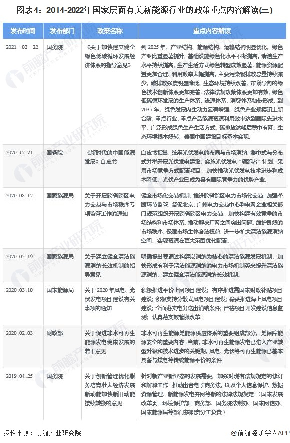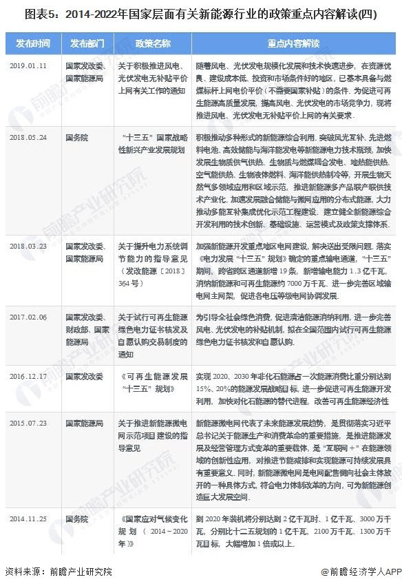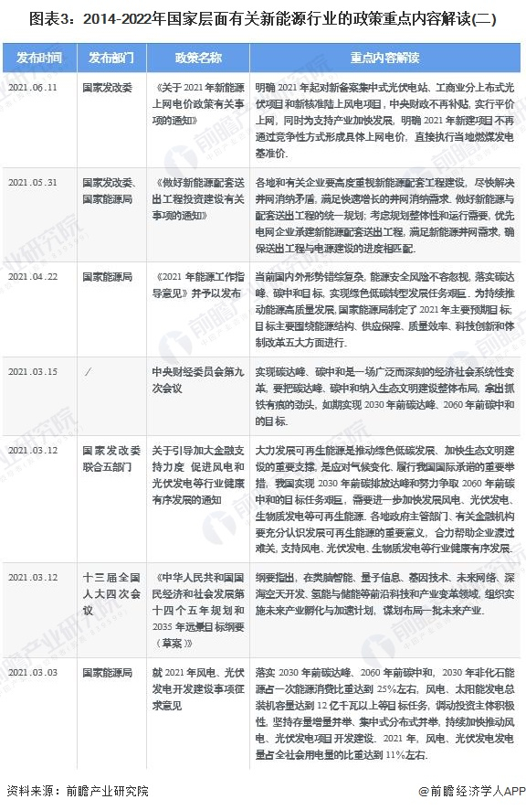 近年来,国务院、国家发改委、国家能源局等多部门都陆续印发了支持、规范新能源行业的发展政策,内容涉及新能源行业的发展技术路线、产地建设规范、安全运行规范、能源发展机制和标杆上网电价等内容,2014-2022年6月,我国新能源行业重点政策及政策解读汇总如下: