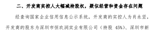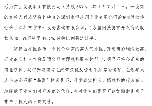 关于减持股权方面,业主认为开发商实控人大幅减持股权,疑似经营和资金存在问题。