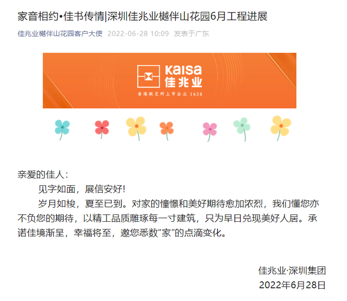 5月20日,佳兆业官方曾发布消息称佳兆业樾伴山于5月上旬已进入全面复工状态,计划2022年10月份达到竣工备案条件(具体以项目实际施工进度为准)。