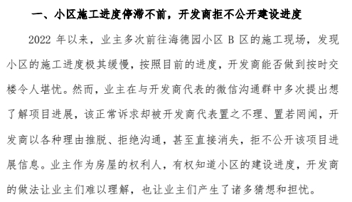 关于项目建设进度方面,业主认为小区施工进度停滞不前,开发商拒不公开建设进度。
