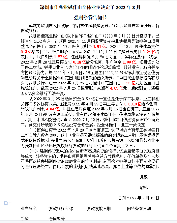 强制停贷告知书中,业主透露,深圳市佳兆业樾伴山2020年8月30日开盘以来,已经售出1452户,该项目2021年11月因监管资金被非法挪用导致樾伴山项目整体全面停工。