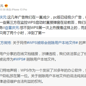 7月11日,WPS官方微博发布了一条关于网传WPS会删除用户本地文件的声明: