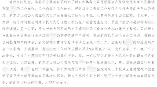 一审法院审理认为,葛某提交证据不足以证明关于年底双薪的主张。新东方迅程公司并未就生产经营情况发生变化举证,且葛某从“资深开发工程师”调整为“技术支持工程师”,会对其职业发展产生影响。新东方迅程公司对葛某进行的调岗缺乏相应的合理性,葛某有权拒绝。
