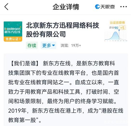 其介绍中显示,公司自成立以来,一直致力于用教育产品和科技工具,打破时间、空间和场景限制,最终为用户的终身学习赋能。2019年,新东方在线在港上市,成为“港股在线教育第一股”。