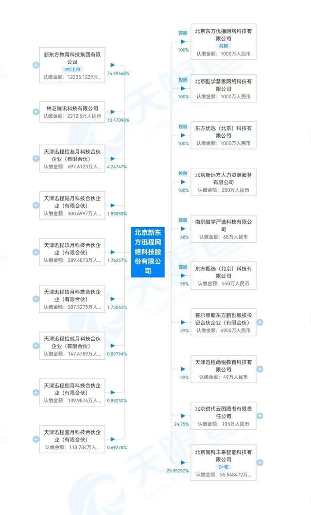 据公开信息显示,新东方迅程公司的股东中,新东方教育科技集团有限公司占据其超74%的股份。而新东方迅程公司又持有55%的东方甄选(北京)科技有限公司股份。
