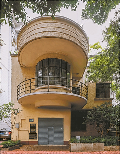 林克明故居大门。弧形窗、钢管栏杆、半圆形的露台保存完好。