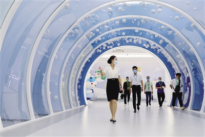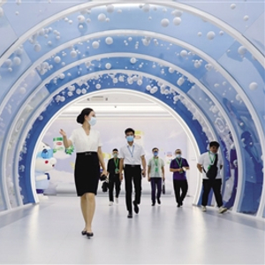 走进总建筑面积近1.4万平方米的场馆,蓝白相间的大厅使用了国内首个品牌理念视觉体验型艺术装置——顶面吊装的柔性屏,这个单元叫作“伊利视界”,它以液态流动的画面,灵动展示了流动着的纯净奶源,寓意着纯净的牛奶永续滋养着健康的生命。壮观、震撼的视觉冲击扑面而来,想象中的未来场景仿佛在这里提前到来。