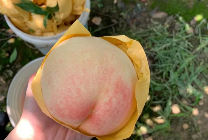 不催熟、无农药残留,采用物理防虫防鸟防晒伤的方式,给桃子进行人工套袋。