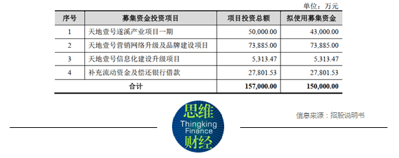 募资用途显示,天地壹号本次IPO拟募资15亿元,其中7.39亿元用于营销网络升级及品牌建设项目,占募资总额的49%;4.3亿元用于遂溪产业项目一期,占募资总额的29%;2.78亿元用于补充流动资金及偿还银行贷款,占募资总额的19%,5300万元用于信息化建设升级项目,占募资总额的3%。