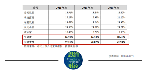 销售人员众多,也让天地壹号的销售费用率远高于同行。招股书中,天地壹号把农夫山泉(09633.HK)、承德露露(000848.SZ)、东鹏饮料(605499.SH)等已上市公司作为同行可比公司。上述公司近三年的销售费用率均值只有17%左右,同期天地壹号的销售费用率高达40%左右。