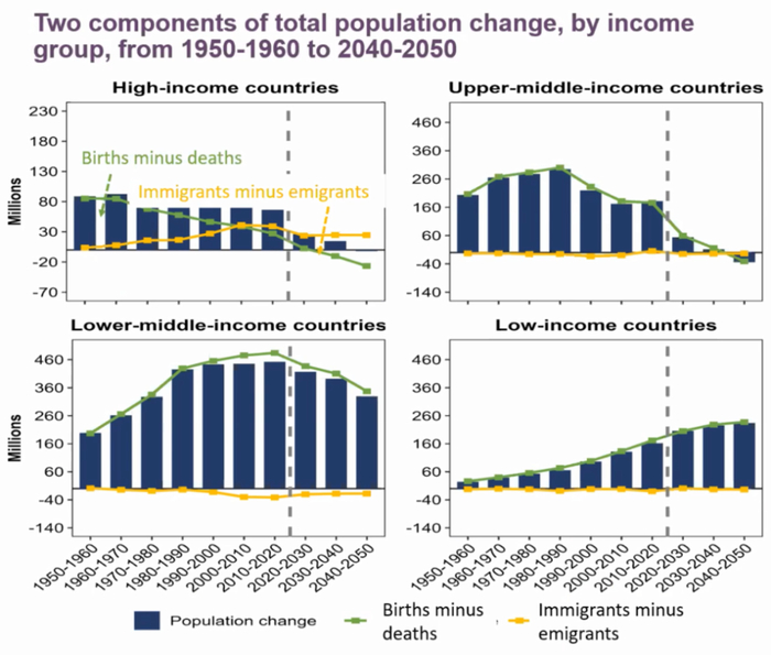 对高收入国家而言,国际人口迁移贡献超过自然增长率。
