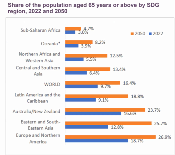 全球65岁及以上人口占比将从2022年的10%上升至2050年的16%。