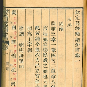清乾隆五十三年(1788),清高宗弘历命臣僚在纂修《四库全书》时,对《诗经》进行全面谱乐,编纂成《钦定诗经乐谱全书》一部。该书对《诗经》的305首诗歌及6篇“补笙诗”进行了全面拟创作,拟作乐谱共有五类、十种乐器之多,其记谱法涉及到工尺字谱、律吕字谱、琴瑟指法字谱等四种记谱形式,谱配乐器十分全面。
