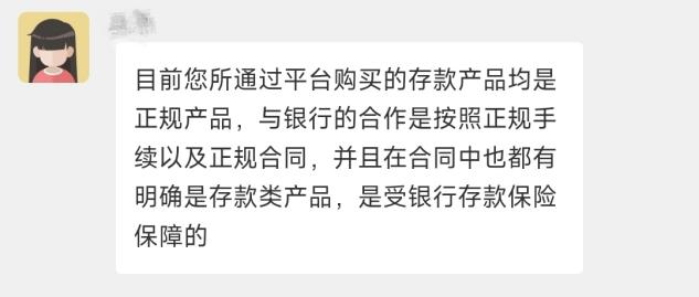 360你财富客服向潘哥表示:“通过平台购买的存款产品,均是正规产品,与银行的合作,是按照正规手续以及正规合同,并且在合同中,也都有明确是存款类产品,是受银行存款保险保障的。”