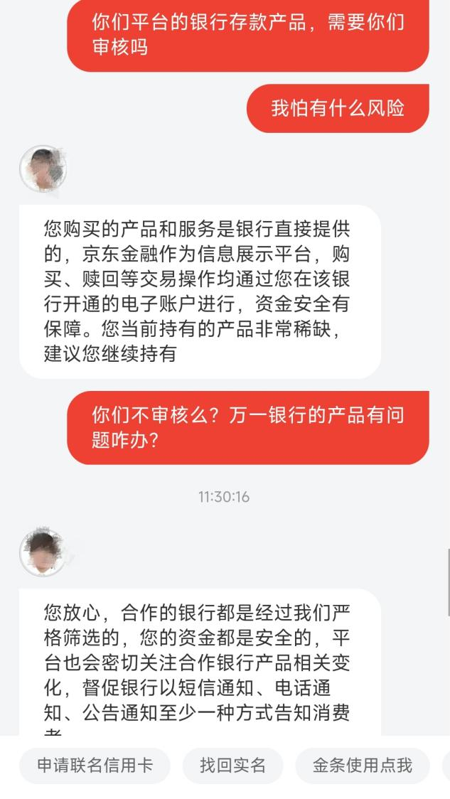 在银行的资质筛选上,京东金融客服则表示:“合作的银行都是经过我们严格筛选的,您的资金都是安全的,平台也会密切关注合作银行产品相关变化。”