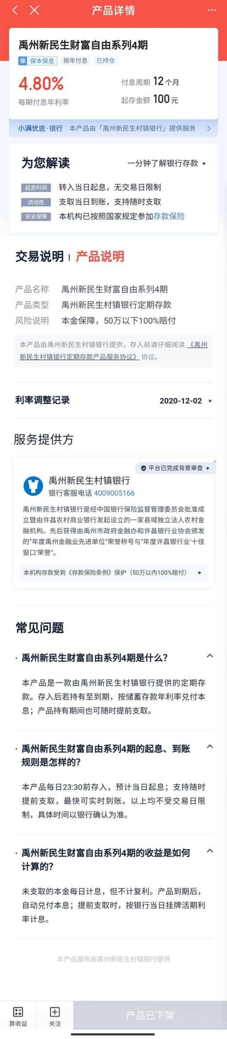 同时,度小满金融还显示:禹州新民生村镇银行,已按照国家规定参加存款保险,平台已对其完成背景审查。