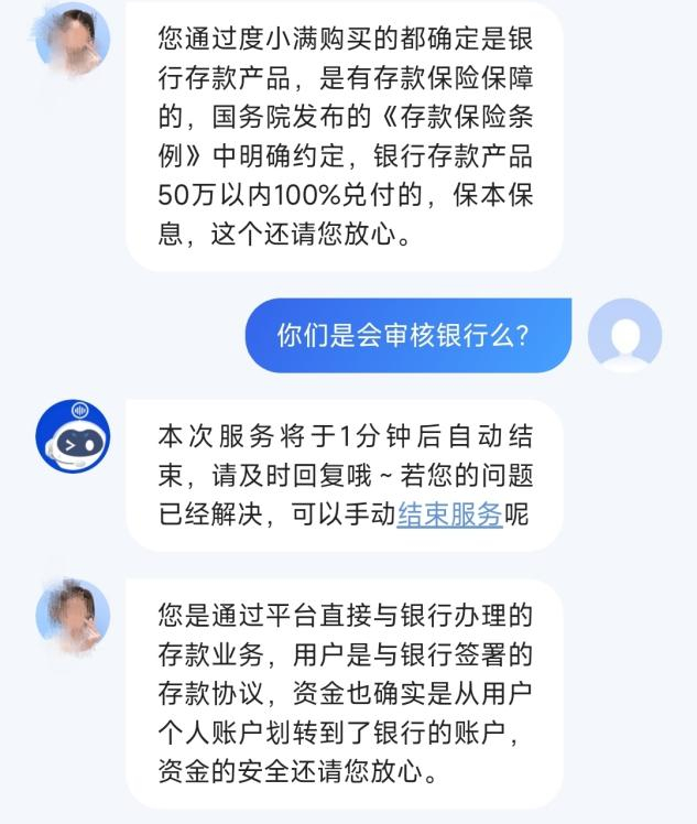 对于潘哥关于银行存款是否安全的疑问,客服则表示:“通过度小满购买的,都确定是银行存款产品,是有存款保险保障的,国务院发布的《存款保险条例》中明确约定,银行存款产品50万以内100%兑付,保本保息。”