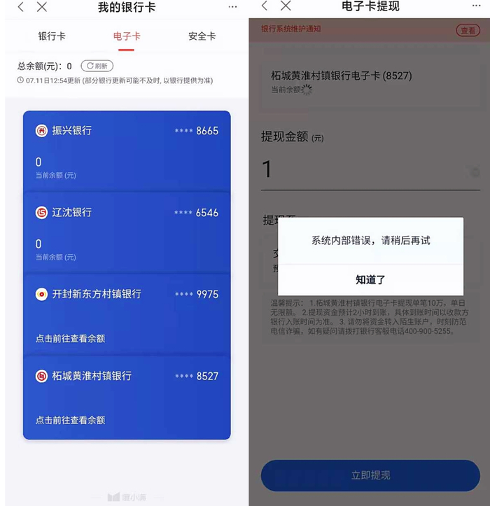 爆雷事件发生后,李女士发现在度小满金融,这两家银行的电子银行卡,已经不再显示余额;而李女士在App进行取款操作时,则始终显示“系统内部错误,请稍后再试”。