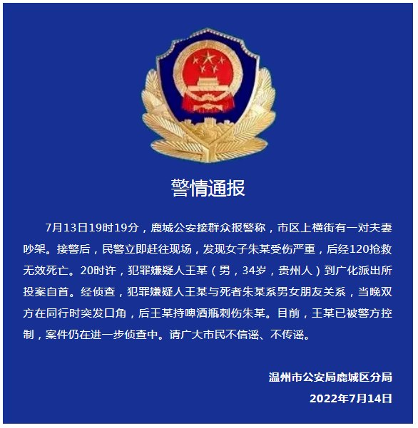 7月13日19时19分,鹿城公安接群众报警称,市区上横街有一对夫妻吵架。接警后,民警立即赶往现场,发现女子朱某受伤严重,后经120抢救无效死亡。20时许,犯罪嫌疑人王某(男,34岁,贵州人)到广化派出所投案自首。经侦查,犯罪嫌疑人王某与死者朱某系男女朋友关系,当晚双方在同行时突发口角,后王某持啤酒瓶刺伤朱某。目前,王某已被警方控制,案件仍在进一步侦查中。请广大市民不信谣、不传谣。