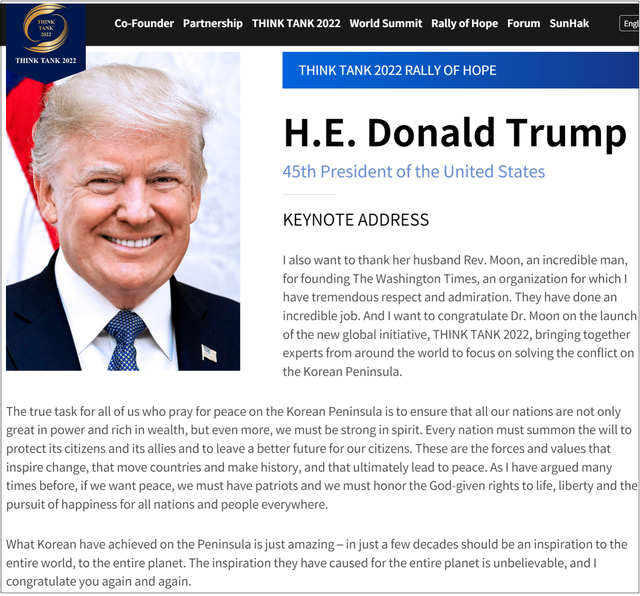 文鲜明还在自己的“言论集”中记载过他对日本政坛的影响力:“这些都是历史的秘密,我原来和中曾根关系很好,每隔40天我就会写一份报告给他,分析当前的政治形势和方向。安倍君当选的时候他的支部只有13个议席,现在他手下的88名议员,都受到了统一教的教育和供养。(《文鲜明言论集191卷》)”