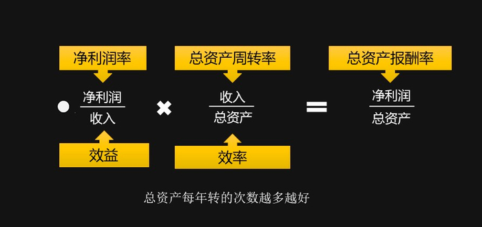 最终,我们形成了“总资产报酬率”衡量投资回报,净利润除以总资产。这个公式说来容易,其实包含评价企业盈利状况的两个维度:效益与效率。