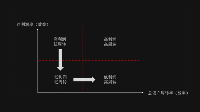 首先,我画了一个坐标图,纵坐标是净利润率(效益);横坐标是总资产周转率(效率)。