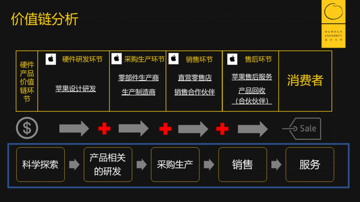 上图的上半部分(黄色框)是苹果的价值链,下半部分(蓝色框)是华为的价值链。二者都历经设计研发、采购生产、销售和售后服务环节,不同的是,华为在底层的科学探索上投入更多。