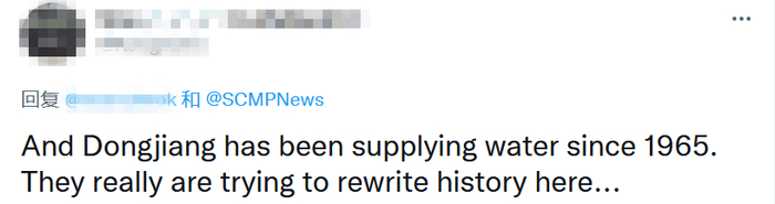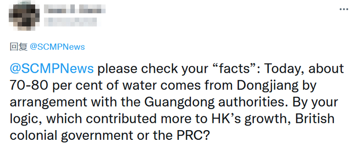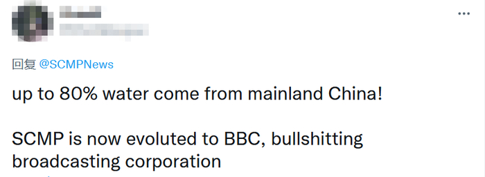 “高达80%的供水来自中国内地!南华早报现在演变成BBC那样胡说八道的媒体。”