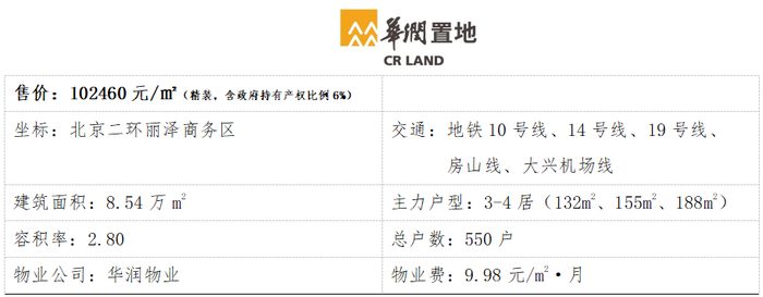 【建筑】建筑设计为“现代雅奢主义风格”,将东方美学融入现代国际化风格。“瑞”,以玉为信,金声玉振,经典永恒。致敬古典美学,以现代语言演绎三段式:基座典雅沉稳,体现近人尺度细腻和温情感;中段横向线条舒展细腻,竖向框架挺括俊朗,简洁大气干净纯粹;建筑顶部浅金色塔冠,源自古都北京传统殿宇。内城红墙楼阁,檐上云卷云舒,浅金色的穿孔金属格栅如折扇展开,光影变换,出檐深远,是华润瑞府尤为奢华的标识ICON。