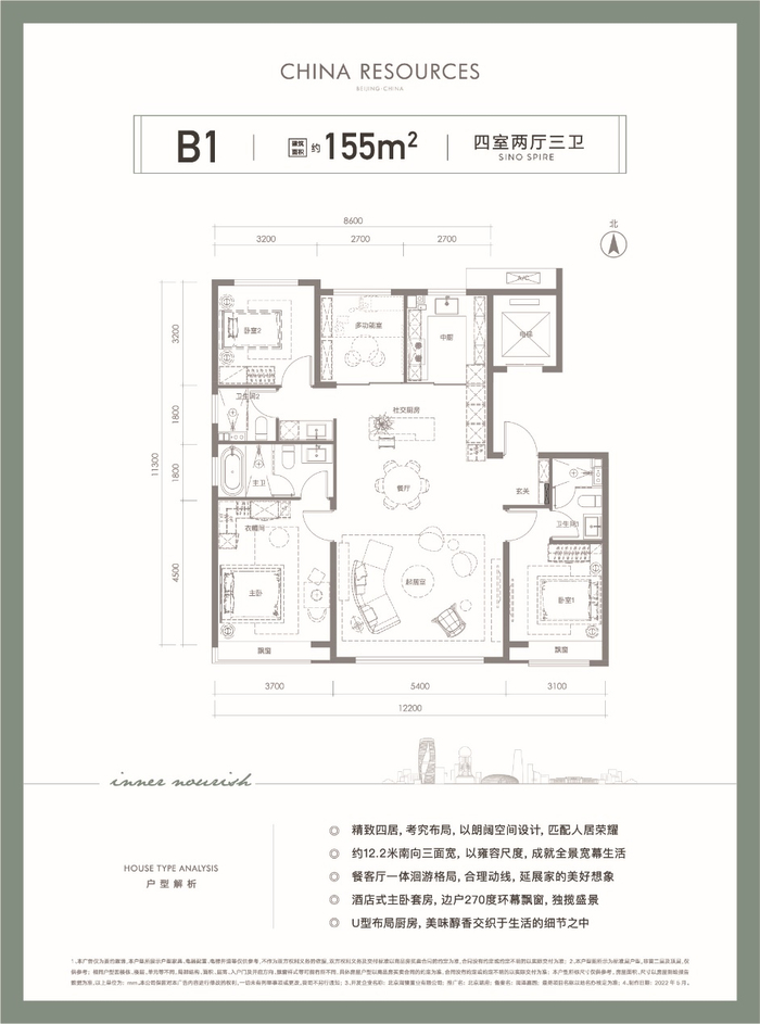 建面约125㎡四居室,南北通透设计,全屋全明户型,每个空间都有明窗。南向三面宽设计,合计约10.6米,尽享阳光与和风。入户独立玄关,餐客厅通体LDK设计,打通全屋视野及气流与情感交流的动线,使居住更健康、更美好。四叶草经典空间布局,四个房间分踞四角,打造完美的动静分离居住体验。