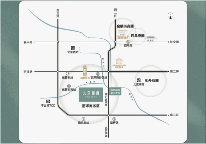 【区位】北京瑞府,地处北京内城聚集商业流、金融流、人才流的核心三角,距丽泽商务区直线距离仅1.5公里,距金融街直线距离仅6公里,北望金融街,近邻丽泽商务区,身畔环绕二环的全唯配套,有着四大商圈的光环辐射,更拥有众多内城公园的原生之美。