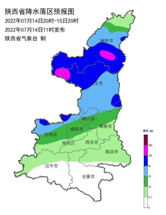 受低涡和副高外围暖湿气流共同影响,预计07月14日20时至15日20时榆林大部、延安、宝鸡北部、咸阳北部、铜川北部、渭南北部将出现大雨(25~50毫米), 其中榆林南部(定边、靖边、横山、榆林市、佳县、绥德、清涧、吴堡、米脂、子洲)、延安北部(吴起、志丹、安塞、子长、甘泉北部、延川北部、延安市北部)、延安东南部(黄龙东部、宜川)、宝鸡北部(陇县)、咸阳北部(长武、彬州北部)、渭南北部(韩城)有暴雨(50~90毫米) ,榆林西南部局地(定边南部)、榆林东部局地(米脂南部、子洲北部、横山东部、绥德西部)、延安西部局地(吴起西部)有大暴雨 (100~160毫米)。过程期间伴有雷暴,局地有短时暴雨、雷暴大风等强对流天气,最大小时雨强30~50毫米,局地可达70毫米以上。 强降水影响区域易出现滑坡、泥石流、崩塌等地质灾害,山洪和中小河流洪水气象风险等级高,请做好应急准备工作,关注当地预警信号和短临预报,适时采取应急措施。