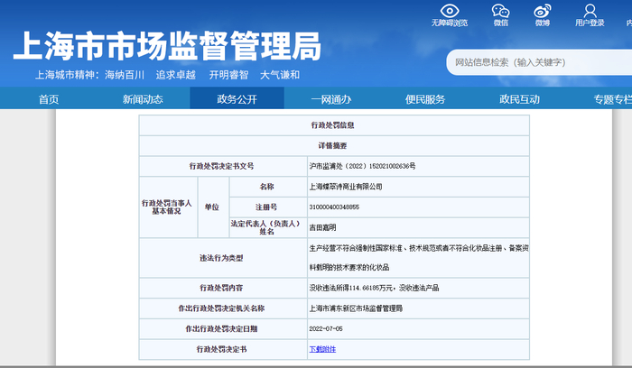 中国网财经7月14日讯 (记者 钟文鑫)据上海市市场监督管理局消息,近日,DHC关联公司上海蝶翠诗商业有限公司因销售不符合安全技术规范的化妆品,被上海市浦东新区市场监督管理局没收违法所得114万余元,并没收违法物品。