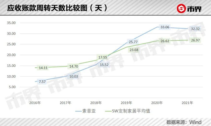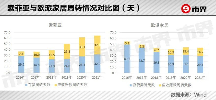 Wind数据显示,索菲亚的应收账款周转天数从2016年的7.6天提高至2021年的32.3天,存货周转天数也有所提高,和2016年相比,整体营业周期延长了大约28天,相比之下,欧派整体则呈现下降趋势,周转效率是有所提升的。