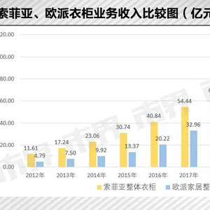 在这之后的几年里,欧派整体衣柜业务增长迅猛,给老对手索菲亚造成巨大的压力——2015年和2019年,索菲亚整体衣柜业务规模分别是欧派家居的2.3倍和1.23倍。