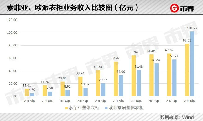 这一承诺在2021年实现,当年欧派衣柜业务营收101.72亿元,首次反超索菲亚,甚至多出近20亿元,一举拿下“衣柜一哥”的宝座,可以说是相当扬眉吐气。