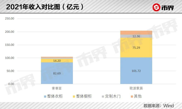2021年,整体衣柜占索菲亚总收入的79%,其他包括厨柜、木门、地板等业务合计只有21.39亿元的营收。但欧派在衣柜业务之外,橱柜就有75亿元收入,其次是12亿元收入的木门业务和10亿元收入的卫浴业务,拼凑出来一个比索菲亚大得多的“蛋糕”。