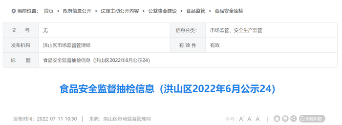 武汉市洪山区食品安全监督抽检信息(2022年6月公示24)