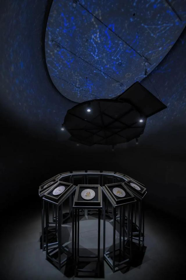 值得一提的是,《洛克菲勒艺术基金收藏展:西方艺术大师》展览采用了新型的展陈方式,5位西方大师的作品分属于不同颜色区域,并充分利用展陈空间,在安藤忠雄设计的筒状结构中,采用珠宝柜展出达利的“十二星盘”,且配以天幕打造整片星空。
